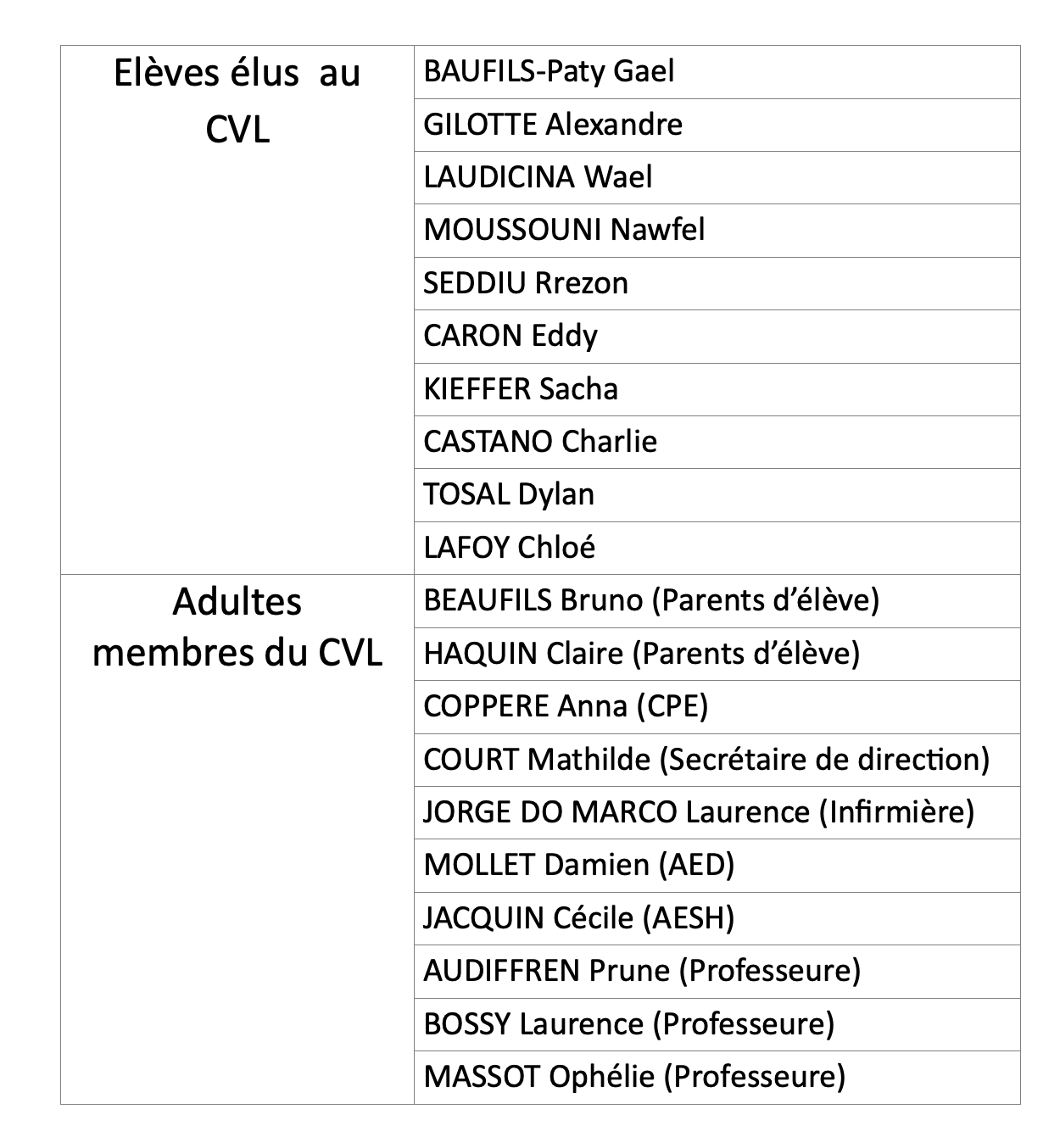 Le CVL, présidé par la cheffe d’établissement, se réunit régulièrement pour faire entendre la voix des élèves sur de nombreux sujets essentiels :